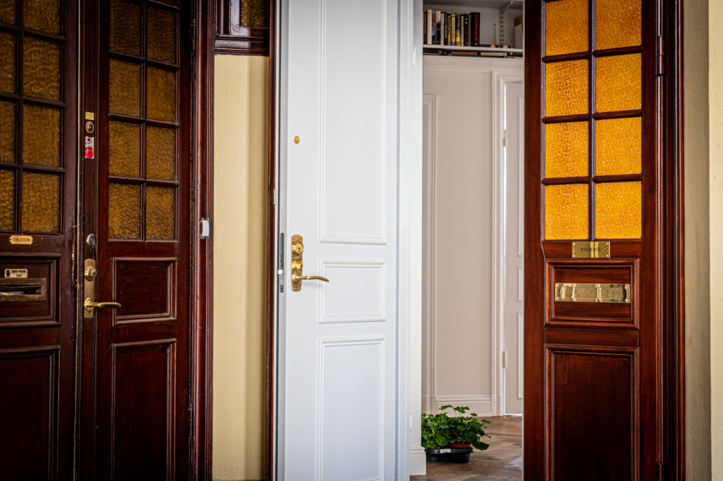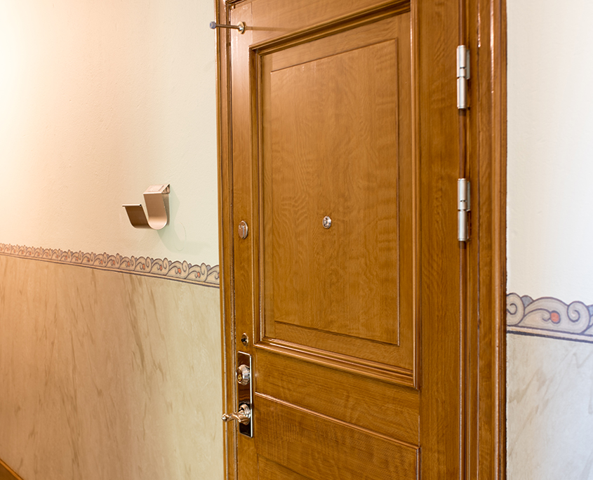 Swedoor säkerhetsdörr i RC3. Tidstypisk posthantering och säkerhetsdörrar i betsad ek.