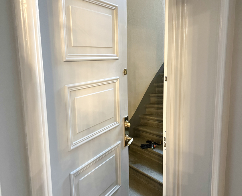 Insida säkerhetsdörr vitmålad dekorlist utsidan panel efter original